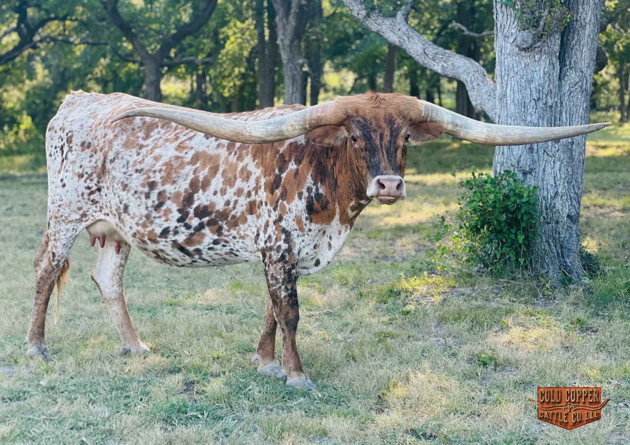 What a beautiful addition to Cold Copper. She is as sweet as she is colorful, and a horn set to die for. She gave us a beautiful heifer by PCC DARK KNIGHT and is currently exposed to POWERWAGON! Check him out